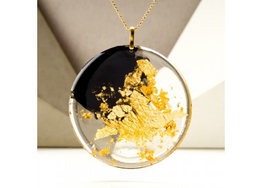 Czarno i transparentna żywica jubilerska. Czaru zawieszce nadają płatki złota.