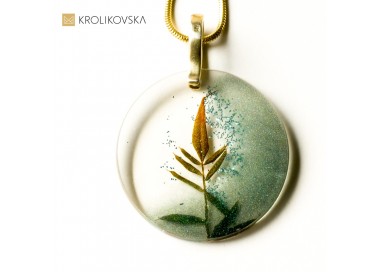 Zawieszkę naszyjnika wykonałam ręcznie z żywicy jubilerskiej. Zatopiłam w niej złote płatki i prawdziwą zieloną roślinę. Zawieszka połączona jest z pozłacanym srebrnym łańcuszkiem próby 925.
