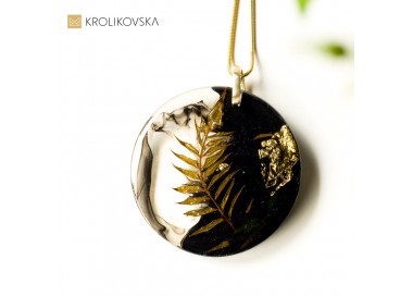Artystyczny naszyjnik z żywicy, na której złote detale tworzą rysunek.